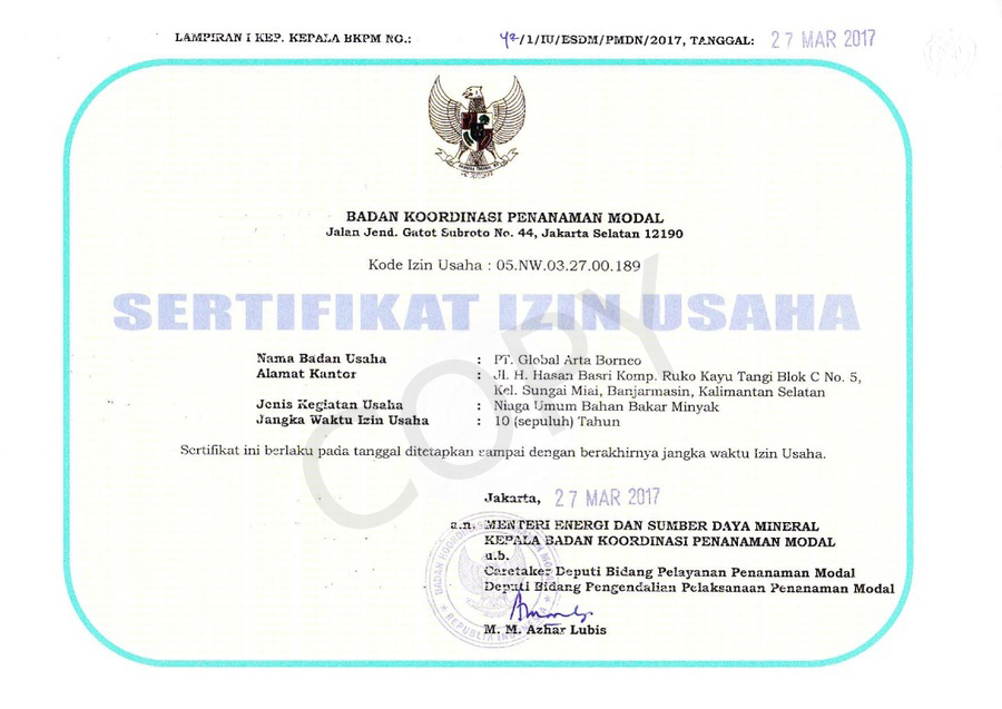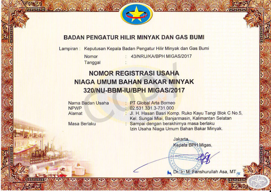 Sertifikat Registrasi Usaha Niaga Umum Bahan Bakar Minyak